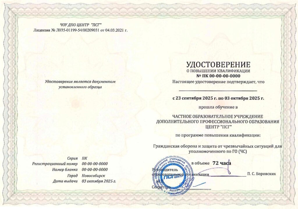 - Программа повышения квалификации «Гражданская оборона и защита от чрезвычайных ситуаций для уполномоченного по ГО (ЧС)», 72ч.